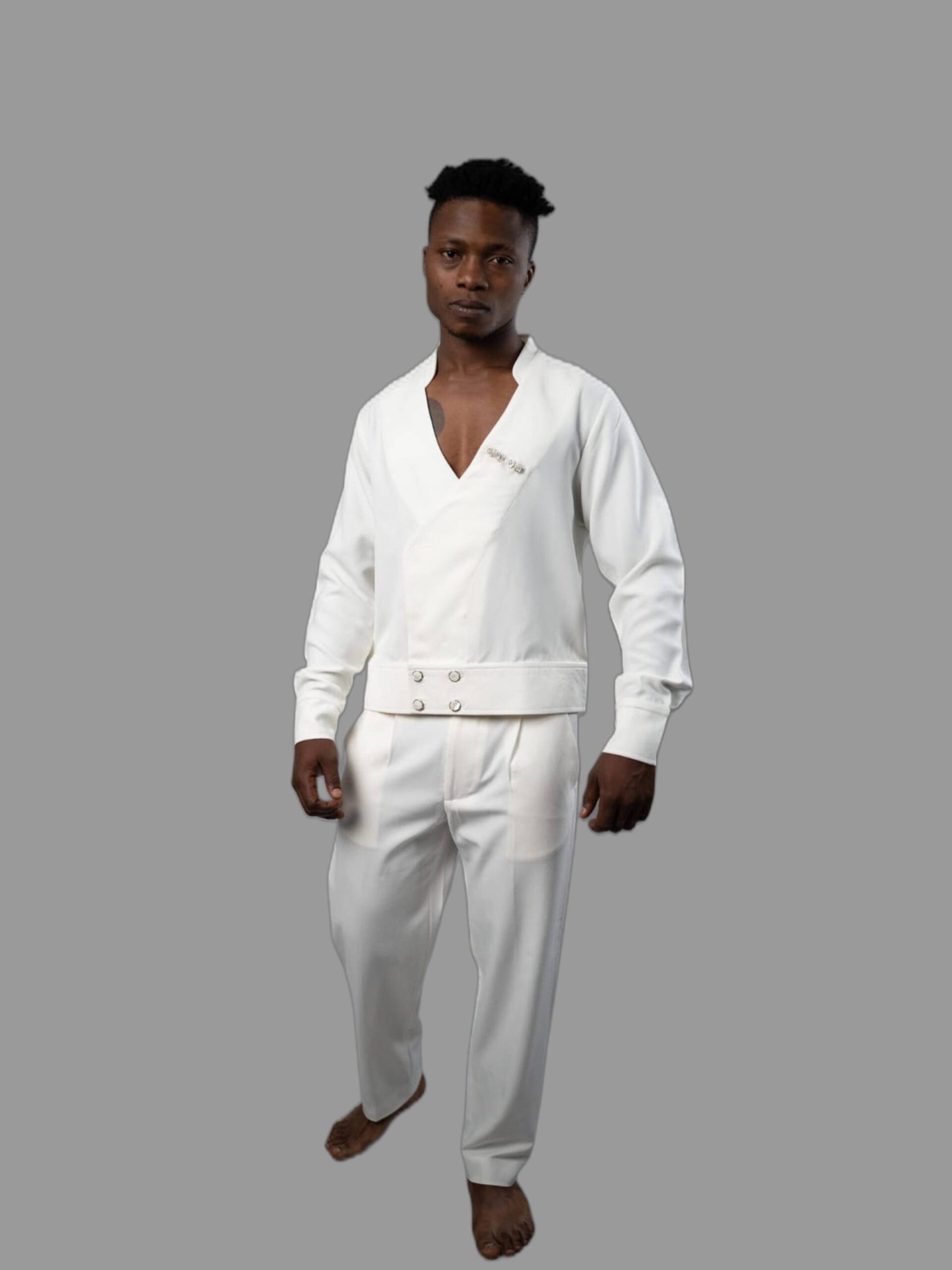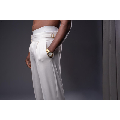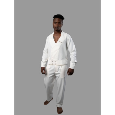 White Wrap Top & Wide-Leg Trousers Set – Minimalist Luxury with Cultural Detailing